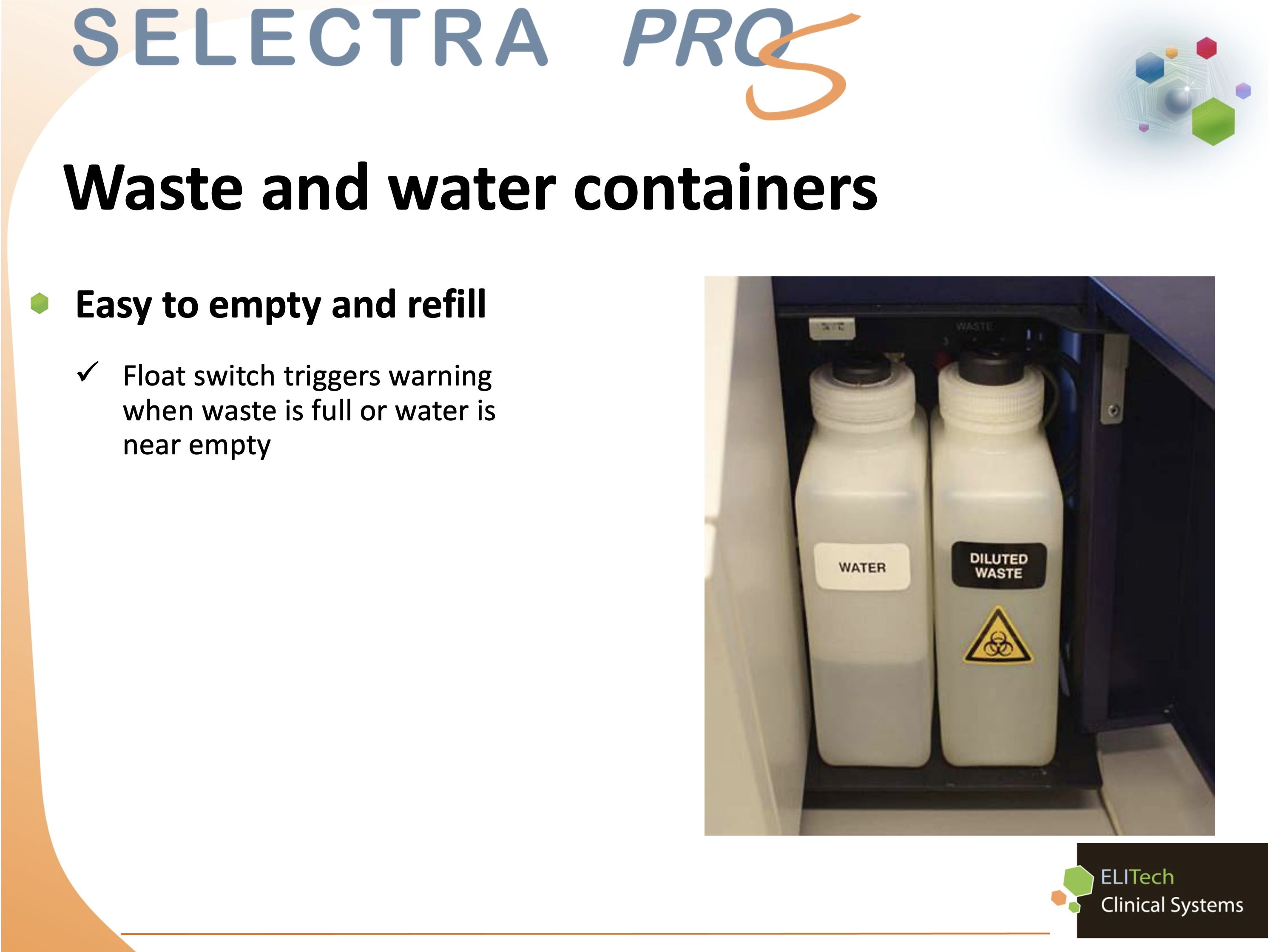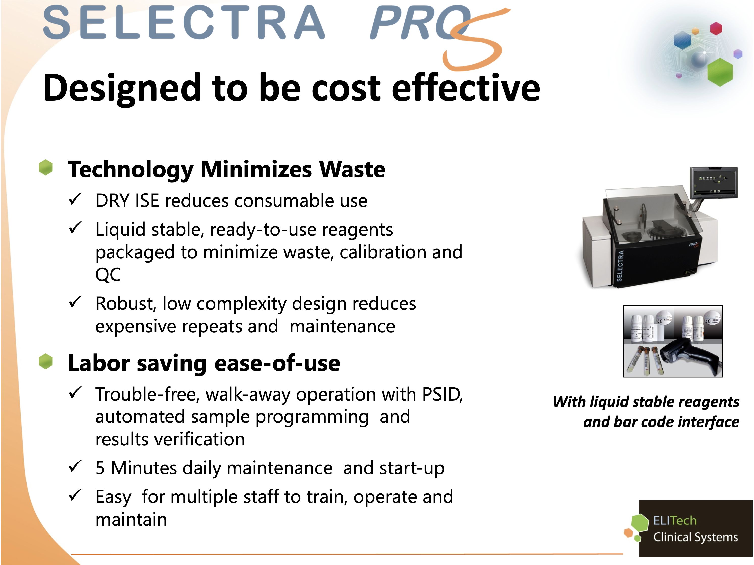 Setting the new standard in benchTop chemistry systems, the Selectra ProM offers a new compact design, with a best-in-class operator interface. New system features enable significant productivity and performance enhancements not typically found in BenchTop chemistry analyzers. Together with a superior menu of ready-to-use, liquid stable reagents, the Selectra ProM provides a fully integrated chemistry solution for smaller or satellite laboratory locations. The Selectra ProM system runs up to 180 photometric tests per hour to serve laboratories with primary, STAT, or backup testing needs. The system offers minimal maintenance and effective use of consumables to truly reduce operational cost